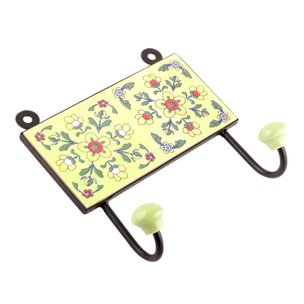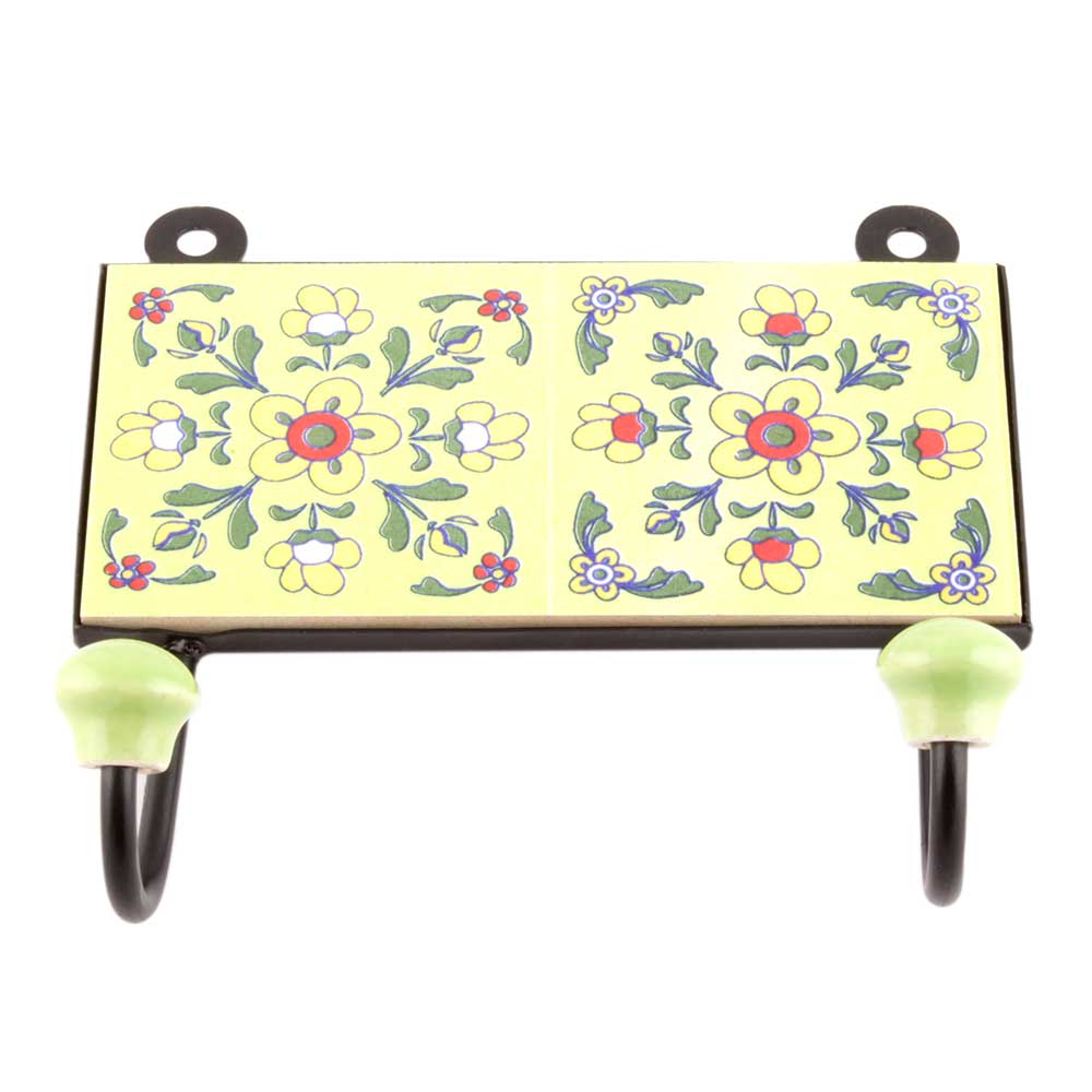 Yellow Ceramic Floral Tiles Hooks. When Put on Wall or Cabinet it is an Art in itself. The Metal Part of this Hook is Black Powder Coated.