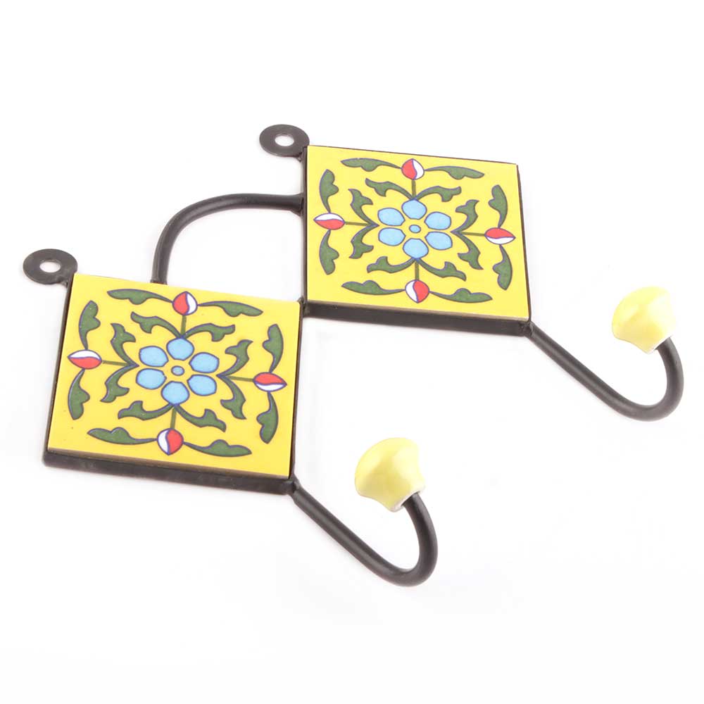 Yellow Ceramic Floral Tiles Hooks Online. When Put on Wall or Cabinet It is An Art in Itself. The Metal Part of this Hook is Black Powder Coated.
