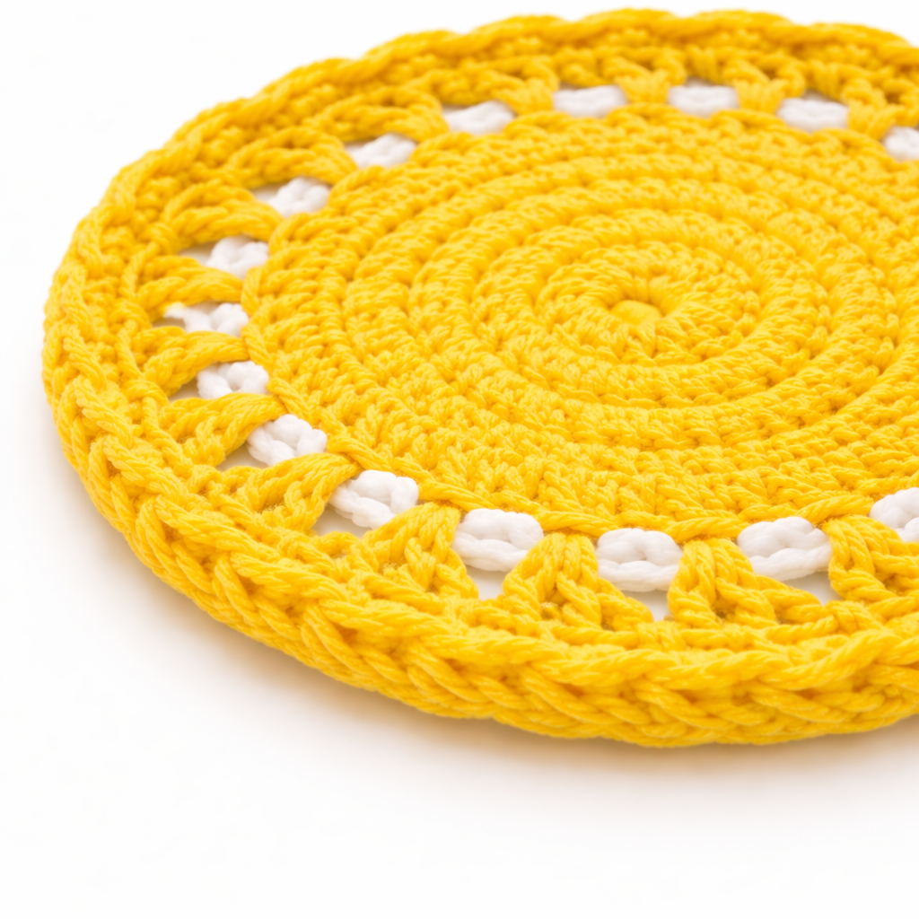 This yellow crochet doily coaster is handcrafted using durable cotton yarn and designed with a classic circular crochet pattern. The vibrant yellow tone adds brightness to everyday table settings while the detailed crochet stitches highlight traditional handmade craftsmanship. Both decorative and functional, this cotton yarn doily protects surfaces from heat and moisture while adding a warm handcrafted touch to home dcor.