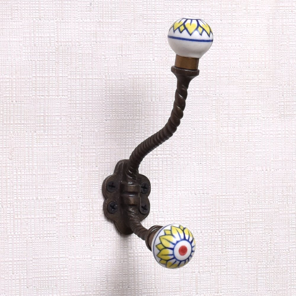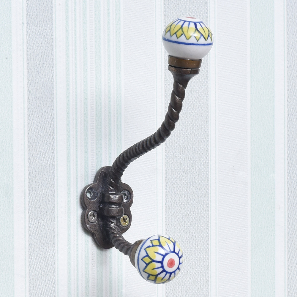 Crafted with durable iron and adorned with a vibrant yellow floral ceramic detail, these hooks are as strong as they are beautiful. The ceramic flowers add a pop of color and life, making them a great addition to both contemporary and traditional decor styles. These hooks are designed to hold various items, making them not only decorative but also practical for everyday use.