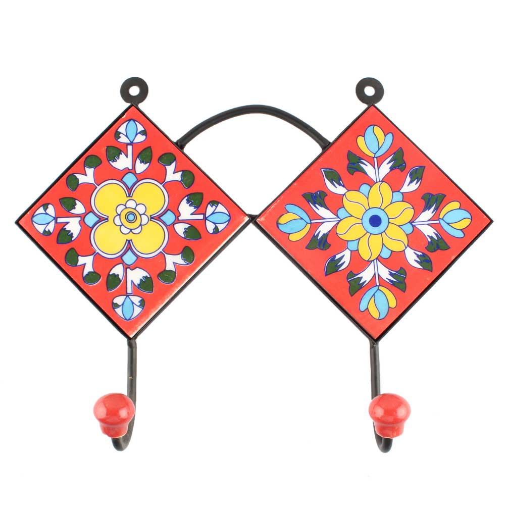 Yellow Floral Ceramic Tile Wall Hook. When Put on Wall or Cabinet It is An Art in Itself. The Metal Part of this Hook is Black Powder Coated.