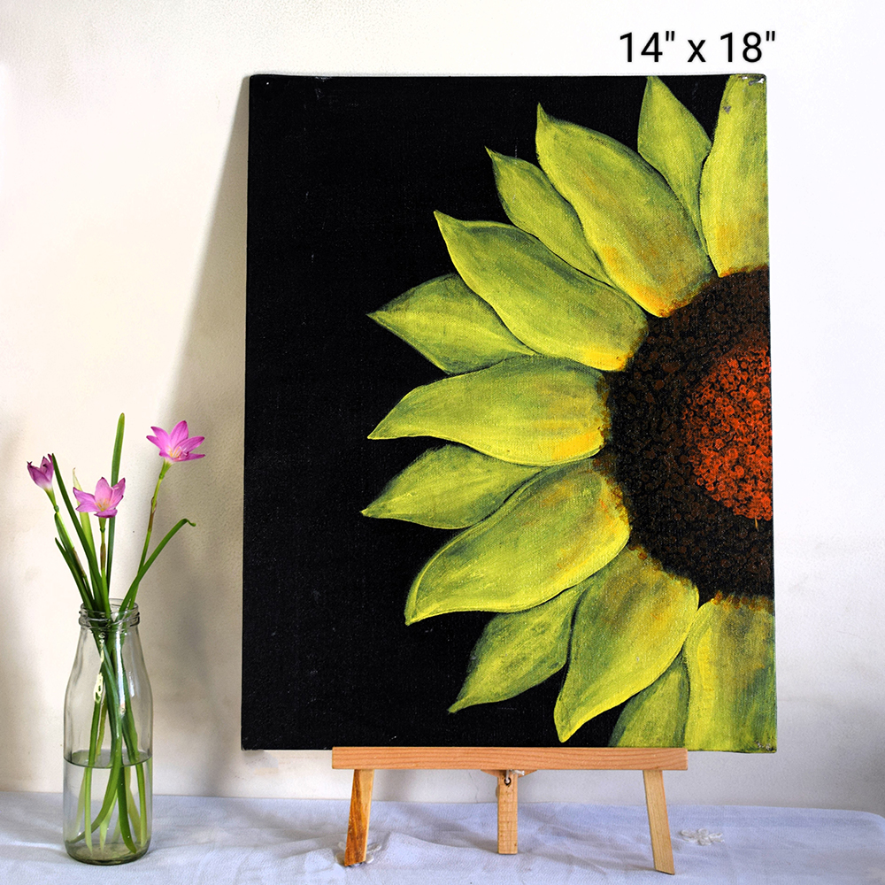 A bold and captivating abstract acrylic painting featuring a vibrant yellow flower against a deep black background. Painted on canvas board, this artwork focuses on the intricate textures and rich tones of sunflower petals, offering a striking play of light and shadow. The minimal composition draws attention to the petal gradients and the textured center, making it a powerful statement piece by Artist Dimpana.