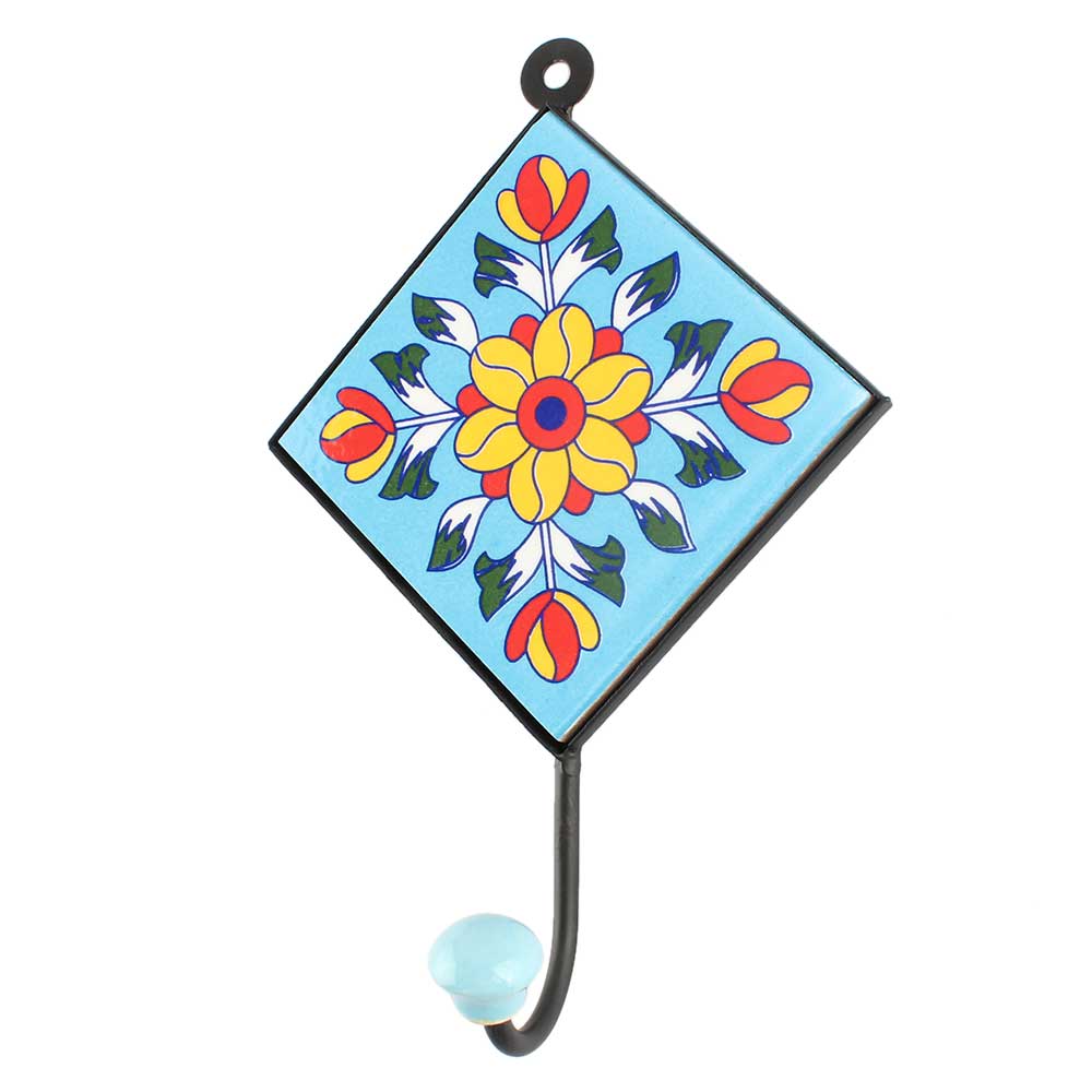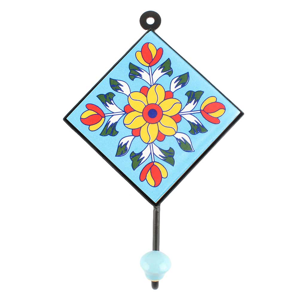 Yellow Flower Ceramic Tile Hook With Turquoise Base. When Put on Wall or Cabinet It is An Art in Itself. The Metal Part of this Hook is Black Powder Coated.