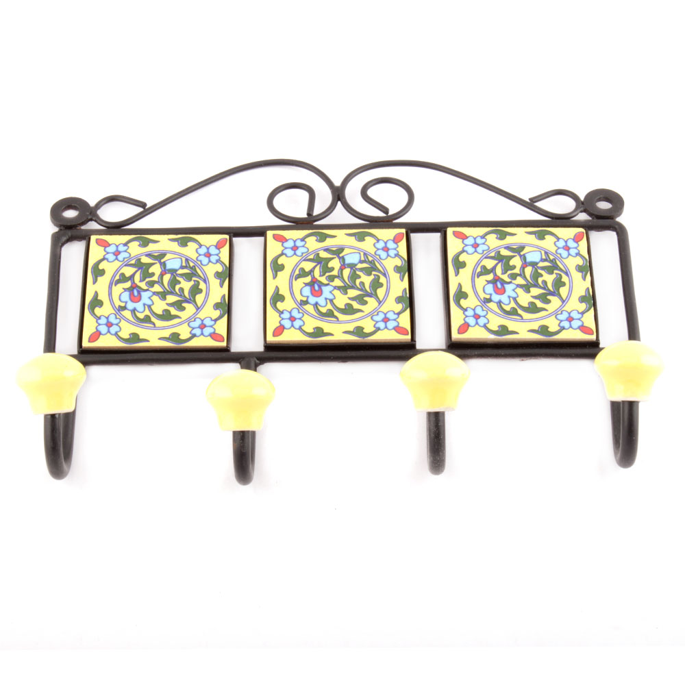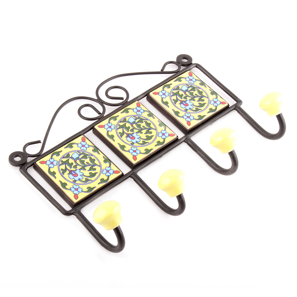 Yellow Forest Green Leaf Floral Tiles Hooks. When Put on Wall or Cabinet it is an Art in itself. The Metal Part of this Hook is Black Powder Coated.
