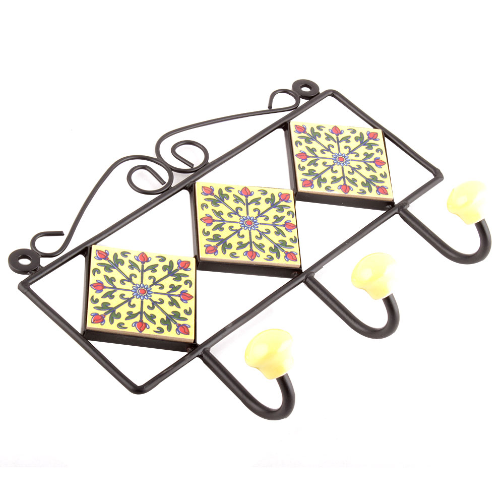 Yellow Forest Green Leaf Tiles Hooks. When Put on Wall or Cabinet it is an Art in itself. The Metal Part of this Hook is Black Powder Coated.