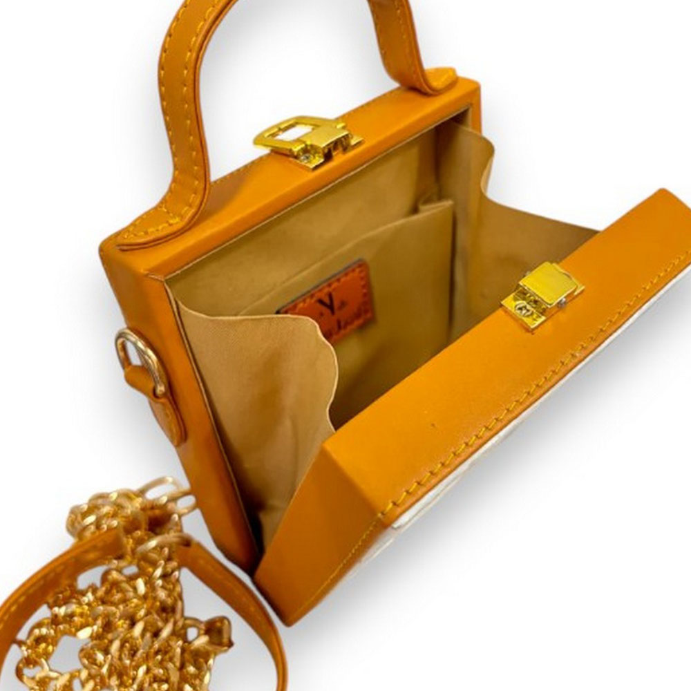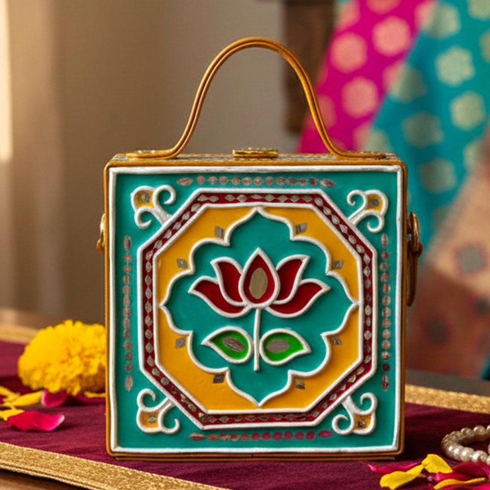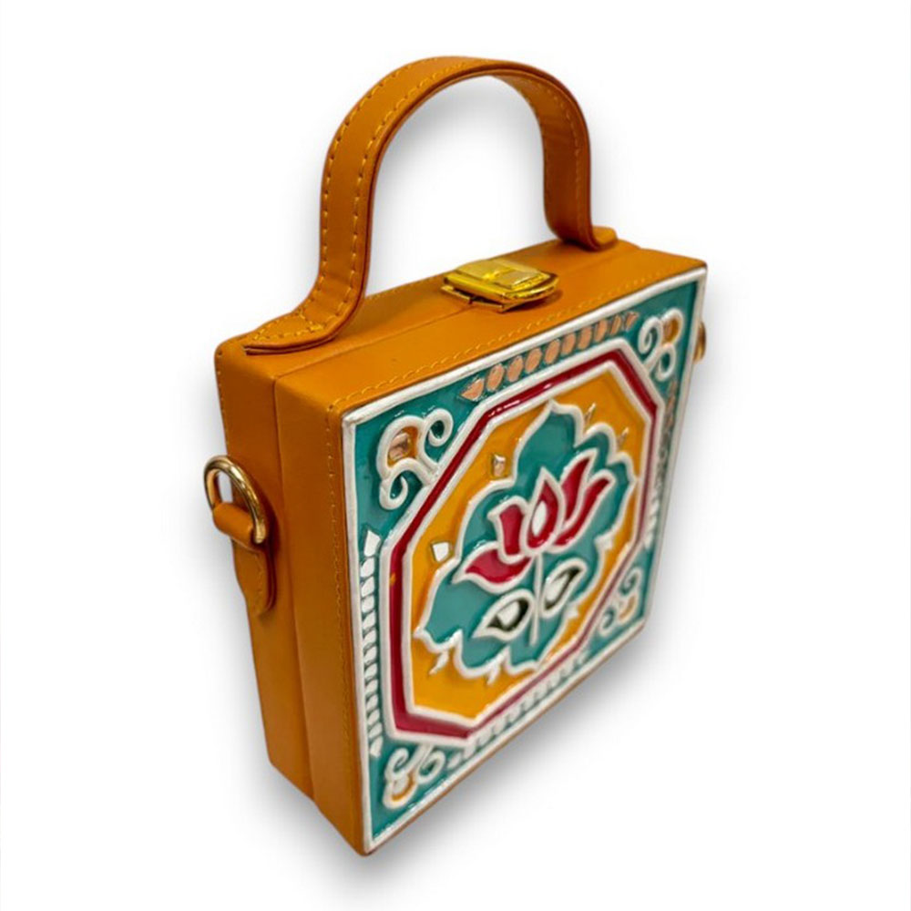 This mini sling box bag showcases yellow inspired Lippan art that blends tradition with modern style. Its compact box form and mirrored details make it appealing to collectors decorators and gifters alike. Each piece is handcrafted by skilled artisans and packed and quality checked by Indianshelf.Yellow Lotus RadianceThis charming piece features yellow motifs in fine Lippan art appealing to those who love unique cultural accessories and those seeking meaningful gifts.Vibrant yellow lotus patterns are hand crafted with mirrored Lippan art.Entirely handmade and never machine madeSturdy design allows everyday wear and decorative placement.Key Material Details Origin: India. Safely packed and quality checked by Indianshelf Comfortable sling design keeps it easy to wear.Daily and Festive UsesUse as a unique accessory at home or out to showcase the yellow lotus motif.Gift this yellow lotus themed bag for festivals birthdays or special celebrations.Enhance boutique displays with its artisanal yellow lotus design to attract customers.Event planners and collectors can use it as an eye catching cultural accent piece.Maintenance GuidelinesPreserve the yellow lotus design by avoiding contact with water and chemicals. Wipe gently with a soft cloth to keep the vibrant Lippan art and mirrors shining.Popular QuestionsWhy is the lotus motif in yellow on this bag?The yellow lotus adds vibrancy and is crafted using traditional Lippan art techniques.Is this mini bag good for regular outings?Yes it is designed to be both colourful and durable for daily use.What does the interior hold?It comfortably carries keys small wallet and other petite essentials.Can the sling be shortened?You can adjust the sling length to your comfort.Artisan EndorsementEvery piece reflects heritage artistry and careful attention to detail. All our products are handmade never machine made ensuring individuality.