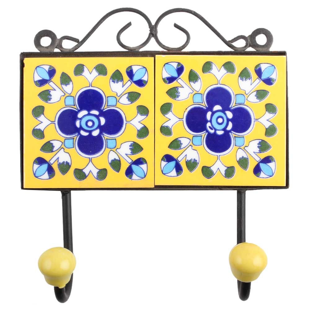 Yellow Navy Blue Floral Tiles Hook. When Put on Wall or Cabinet It is An Art in Itself. the Metal Part of This Hook is Black Powder Coated.