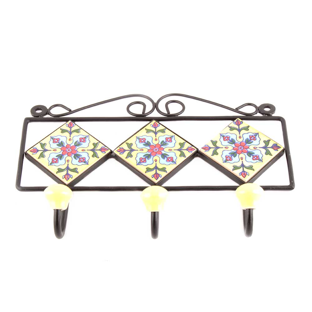 Yellow Red Tiny Flower Tiles Hooks. When Put on Wall or Cabinet it is an Art in itself. The Metal Part of this Hook is Black Powder Coated.