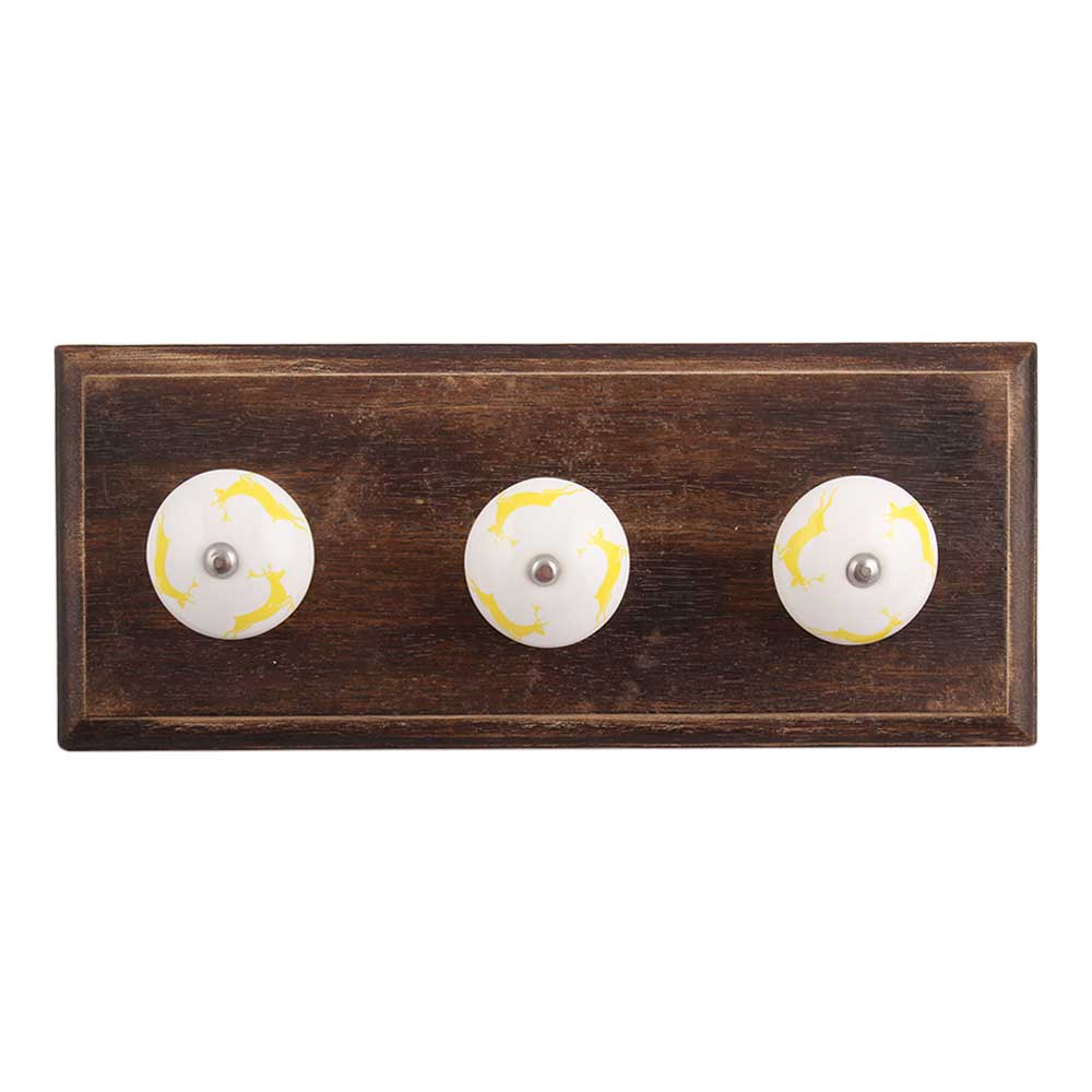 Yellow Running Rein Deer Pattern Ceramic Wooden Hook. A Perfect Complement to the Soft Tone of the Wood are these White Traditional Hat & Coat Hook Made of Genuine Porcelain and Brass. It can be use to Hang Jewellery, Leashes, Towels, Scarves, Light Weight Sweaters, Caps Etc.