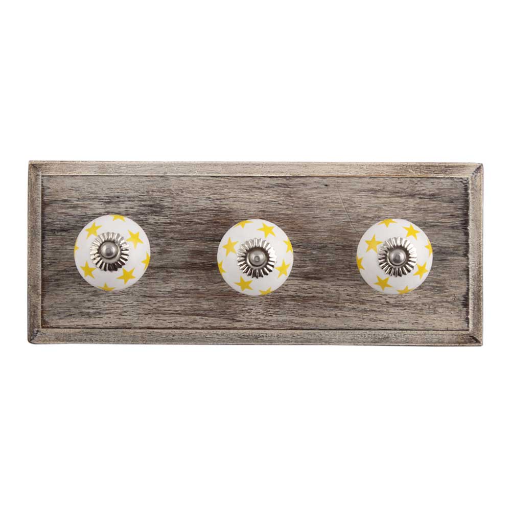 Yellow Star Ceramic Wooden Hook. A Perfect Complement to the Soft Tone of the Wood are these White Traditional Hat & Coat Hook Made of Genuine Porcelain and Brass. It can be use to Hang Jewellery, Leashes, Towels, Scarves, Light Weight Sweaters, Caps Etc.