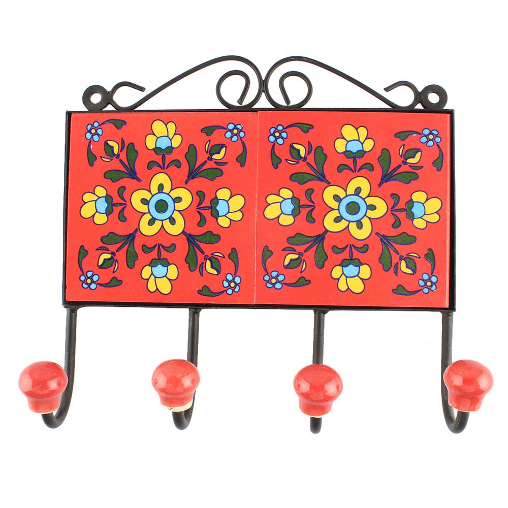 Yellow Tiny flower Ceramic Tile Hook. When Put on Wall or Cabinet It is An Art in Itself. The Metal Part of this Hook is Black Powder Coated.