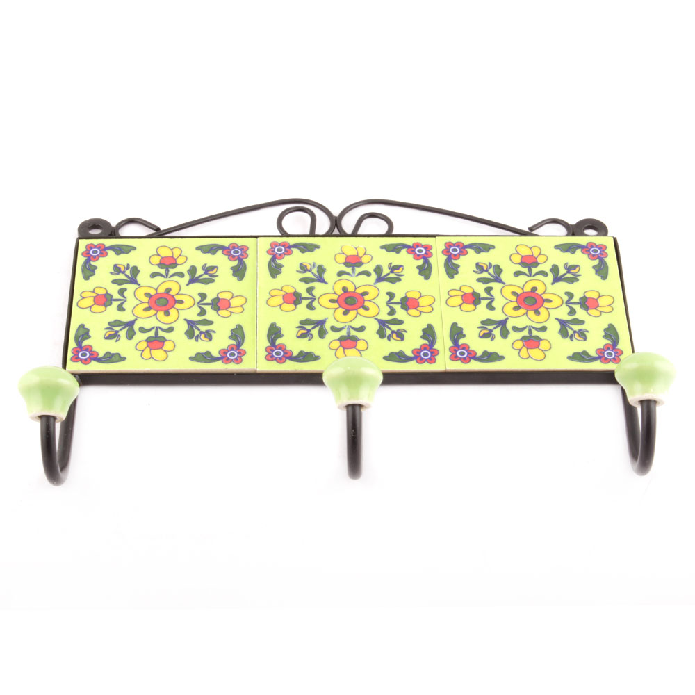Yellow Tiny Flower Tiles Hooks. When Put on Wall or Cabinet it is an Art in itself. The Metal Part of this Hook is Black Powder Coated.