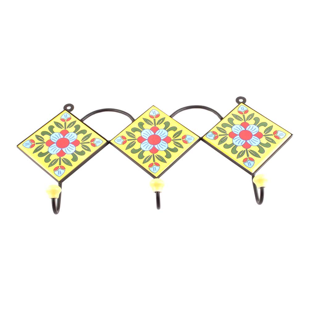 Yellow Turquoise Ceramic Floral Tiles Hooks Online. When Put on Wall or Cabinet it is an Art in itself. The Metal Part of this Hook is Black Powder Coated.