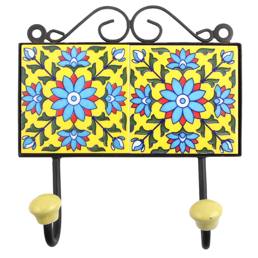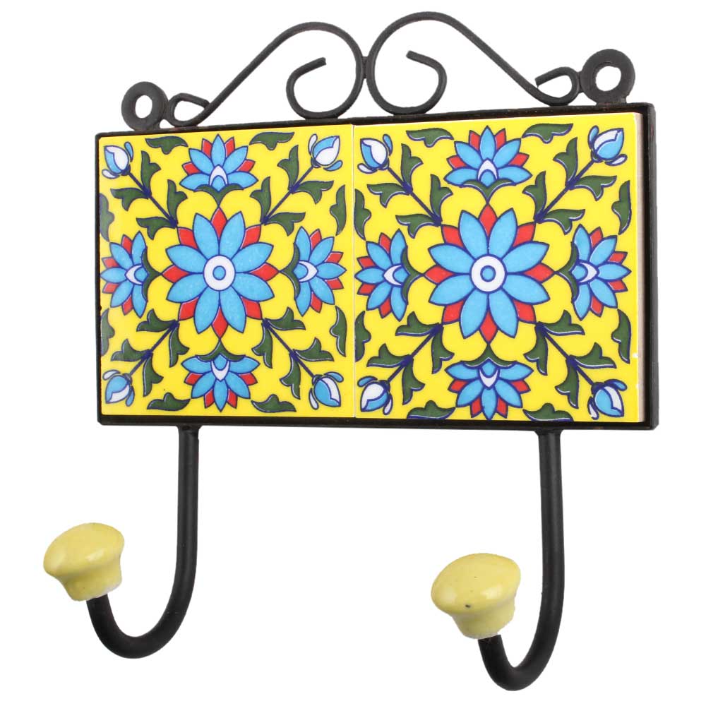 Yellow Turquoise Floral Tiles Hook. When put on wall or cabinet it is an art in itself. The metal part of this hook is black powder coated.