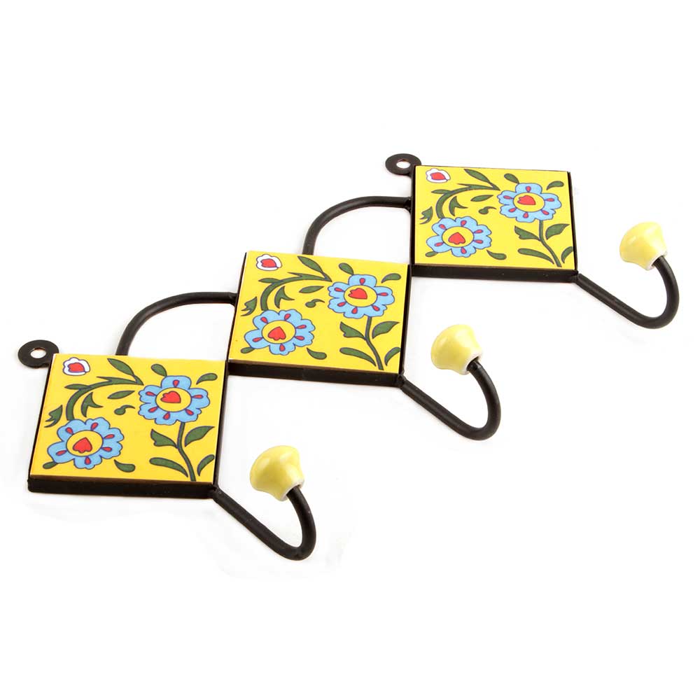 Yellow Turquoise Flower Tiles Hook. When Put on Wall or Cabinet It is An Art in Itself. the Metal Part of This Hook is Black Powder Coated.