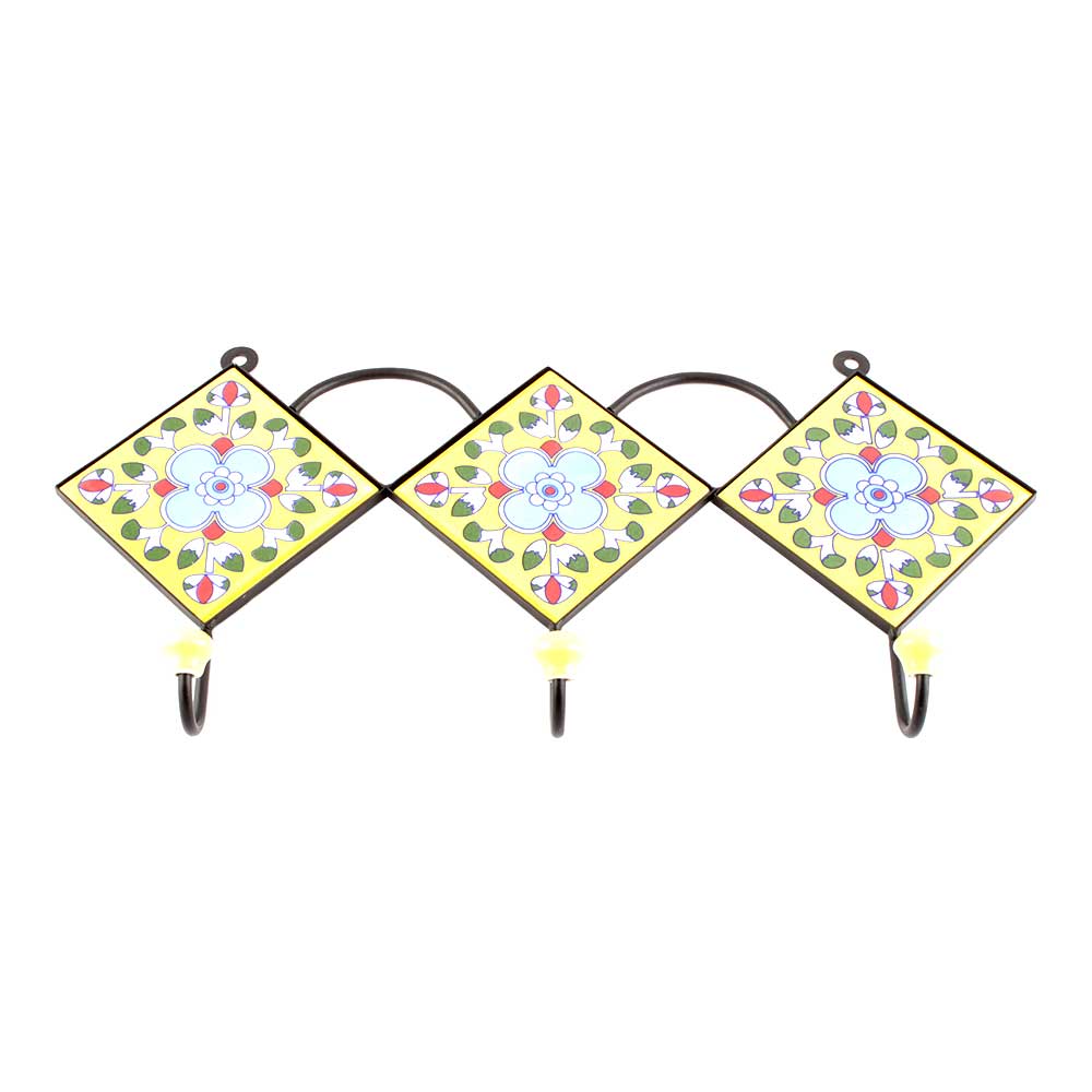 Yellow Turquoise Tiny Floral Tiles Hooks. When Put on Wall or Cabinet it is an Art in itself. The Metal Part of this Hook is Black Powder Coated.