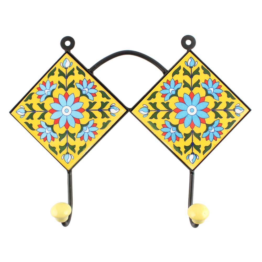 Yellow With Turquoise Sunflower Ceramic Tiles Hook Online. When Put on Wall or Cabinet It is An Art in Itself. The Metal Part of this Hook is Black Powder Coated.