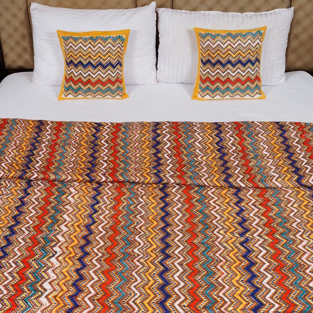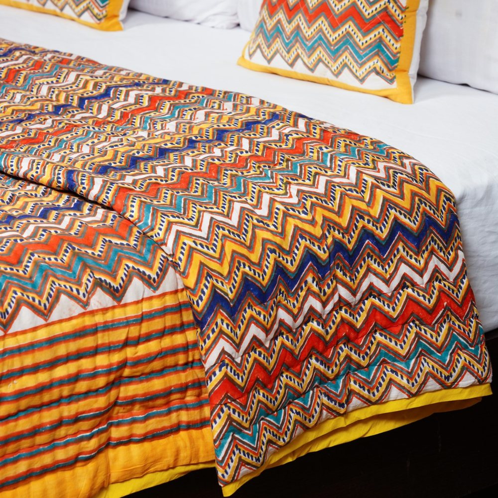 This multicolor Malmal (Voile) quilt features a stunning chevron pattern crafted with traditional Indian hand-block printing techniques. With its warm tones and modern geometric flair, it’s perfect for adding texture and character to your bedroom. Expertly handmade and quality-checked by Indianshelf, this quilt blends artistry with everyday comfort.
